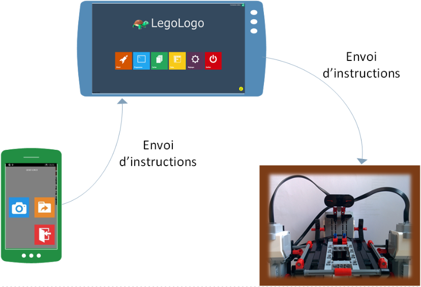 Cet apprentissage passe par l’utilisation de Lego, de cartes à jouer et d’appareils électroniques, qui sont une tablette tactile et un smartphone. Le but de notre travail était de créer une application à travers laquelle les enfants peuvent organiser leurs idées, créer leurs programmes pour au final interagir avec le robot. L’utilisation par des enfants implique certaines contraintes, comme la simplicité d’utilisation du produit final ainsi qu’une automatisation maximale des protocoles de connexion aux différents composants. Au cours de ce rapport, nous détaillerons les technologies utilisées, nous apporterons des solutions aux problèmes que nous avons rencontrés et enfin nous présenterons l’application et les différentes fonctionnalités disponibles.
