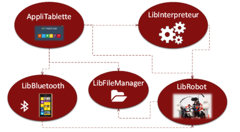 On doit être capable de piloter le robot à l’aide d’une API que nous avons développée en C# en utilisant le travail déjà réalisé par d’autres programmeurs et déposé librement. Ce travail se constituait d’une API pouvant communiquer avec le robot et lui envoyer des ordres de manières asynchrones. Ces ordres se résument à de simples actions telles que faire tourner pendant 500 millisecondes le moteur branché sur le port A du robot ou jouer un son en lui donnant une certaine tonalité. Cependant, pour les besoins de notre projet, nous avons dû créer des fonctions synchrones en utilisant ces ordres. L’utilisation de cette API nous a permis un gain de temps considérable car nous avons pu nous concentrer directement sur les fonctions nécessaires à notre projet. Cette API que nous avons développée prenait en considération les conditions suivantes: