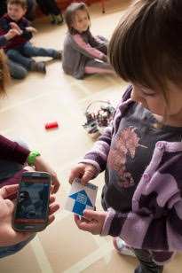 - Le mode cartes : L’idée de la tortue LOGO était de pouvoir commander la tortue à l’aide de cartes perforées contenant les programmes à réaliser. L’utilisateur pouvait donc créer ses programmes en perforant les cartes de la bonne manière. Notre projet devait reprendre l’idée de l’utilisation des cartes perforées, nous avons donc travaillé afin d’adapter cette idée aux nouvelles technologies. La solution qui a été retenue a été l’utilisation d’un Smartphone porté par le robot et qui est en charge d’identifier les cartes que l’utilisateur lui présente. Sa caméra est utilisée pour reconnaitre les cartes de jeu, chaque carte correspondant à un déplacement ou une action. L’utilisateur montre donc au téléphone les cartes qui composent son programme les unes après les autres et il décide quand exécuter le tout. L’échange d’information entre le téléphone et la tablette s’effectue par le biais d’une connexion Bluetooth. De la même manière que pour les tuiles, chaque carte montrée au téléphone est convertie en un mot de notre Langage. Le téléphone ne pouvant pas envoyer d’instructions au robot, cette action est déléguée à la tablette. Les instructions reconnues par le téléphone sont donc envoyées à la tablette qui exécute les actions correspondantes. Lorsque l’utilisateur envoie un programme à la tablette, le serveur Bluetooth de cette dernière lance un évènement. L’abonnement à celui-ci nous permet d’afficher une notification à l’utilisateur stipulant qu’un programme a bien été envoyé au robot ou bien qu’une erreur est présente dans le programme. En plus d’afficher une notification, nous mettons également à jour la liste d’instructions affichée dans le mode carte. Nous avons donc réalisé une interface graphique permettant de visualiser les instructions transitant par la tablette. L’utilisateur peut donc retrouver les instructions sous la forme de tuiles de la même manière qu’au sein du mode Tuiles.