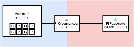 Notre réseau peut se résumer à trois grands acteurs : la pool de Raspberry Pi, qui aura pour mission de faire fonctionner notre petit programme lorsque l’on lui demandera ; un ordonnanceur - dont on reparlera plus tard - qui va nous permettre d’orchestrer nos Pi (quand, quoi et comment exécuter le programme) ; et enfin une passerelle, afin de faire le lien avec l’extérieur. Pour faire les choses proprement, on choisit de cloisonner nos acteurs par responsabilité : la pool d’une part, de l’autre l’extérieur et entre-deux l’ordonnanceur qui vient faire le pont. On se sert des VLAN, pilotés par notre switch managé, pour matérialiser notre architecture dans le réseau.