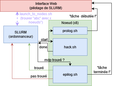 Voici un schéma simplifiant le mode de fonctionnement de SLURM et la façon dont il s’intercale avec notre petit bruteforceur de mot-de-passe (on distingue également l’interface web dont nous discuterons un peu plus tard) :